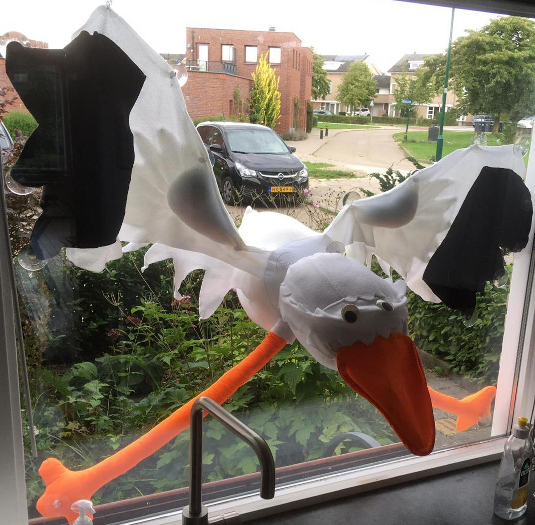De voorkant en achterkant zijn gescheiden. Hierdoor creëer je een 3D effect wanneer je de ene kant binnen en de andere kant buiten ophangt. De ooievaar is ongeveer 150 centimeter groot en kan worden bevestigd met zuignappen.