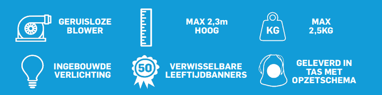 Het opzetten en afbreken van een feestpop gaat makkelijk met 1 persoon. Omdat er een ingebouwde blower in het opblaasfiguur zit. Stekker in het stopcontact en opzetten maar!